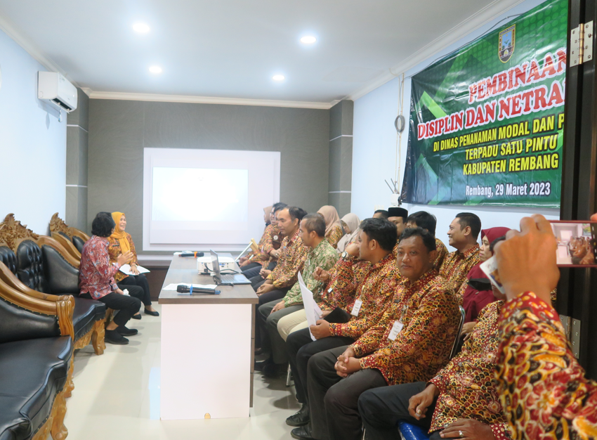 RILISJATENG.COM– DPMPTSP Rembang, Pada hari Rabu, 29 Maret 2023 bertempat di ruang rapat Mal Pelayanan Publik Kabupaten Rembang dilaksanakan Pembinaan Disiplin dan Netralitas ASN di lingkungan DPMPTSP Kab. Rembang. Dalam acara tersebut turut dibacakan ikrar Netralitas Pegawai Aparatur Sipil Negara oleh Kepala DPMPTSP Ibu Imung Tri Wijayanti, SP, MT, MA dan diikuti oleh seluruh ASN DPMPTSP Kab. Rembang. Acara kemudian dilanjutkan dengan Penandatanganan Pakta Integritas untuk semua ASN disaksikan oleh Sekretaris Daerah Kab. Rembang yang diwakili oleh Asisten Bidang Administrasi Umum Bapak Drs. H. Waluyo. Penandatanganan pakta integritas secara simbolis dilaksanakan oleh Kepala DPMPTSP, Sekretaris DPMPTSP, Kabid Penanaman Modal, dan Plt. Kabid PTSP.