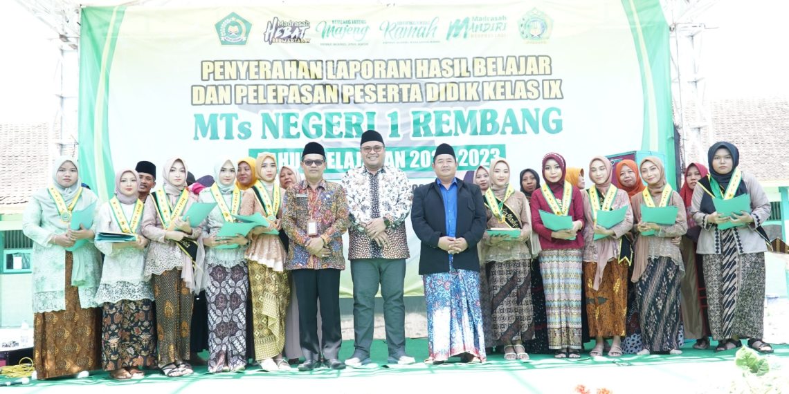 RILISJATENG.COM– Suasana meriah terdengar dari MTs Negeri 1 Rembang, pada wisuda kelas 9 tahun pelajaran 2022/2023 M, Sabtu (10/6/2023).