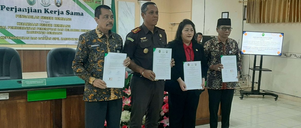 Kerjasama ditandai dengan MoU yang ditandatangani Ketua PN Rembang Liena, Kejari Rembang I Wayan Eka Widdyara, Kepala Dinsos PPKB , Prapto Raharjo dan Kepala Dindukcapil Suparmin di kantor Pengadilan Negeri Rembang, Selasa (25/3/2025).